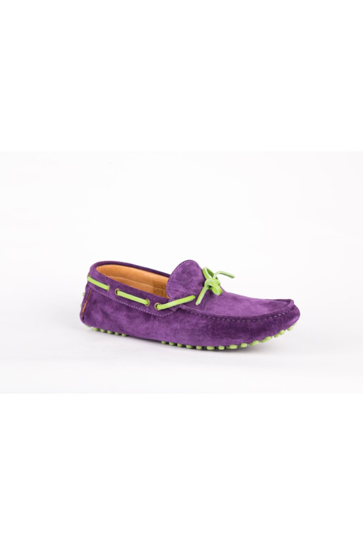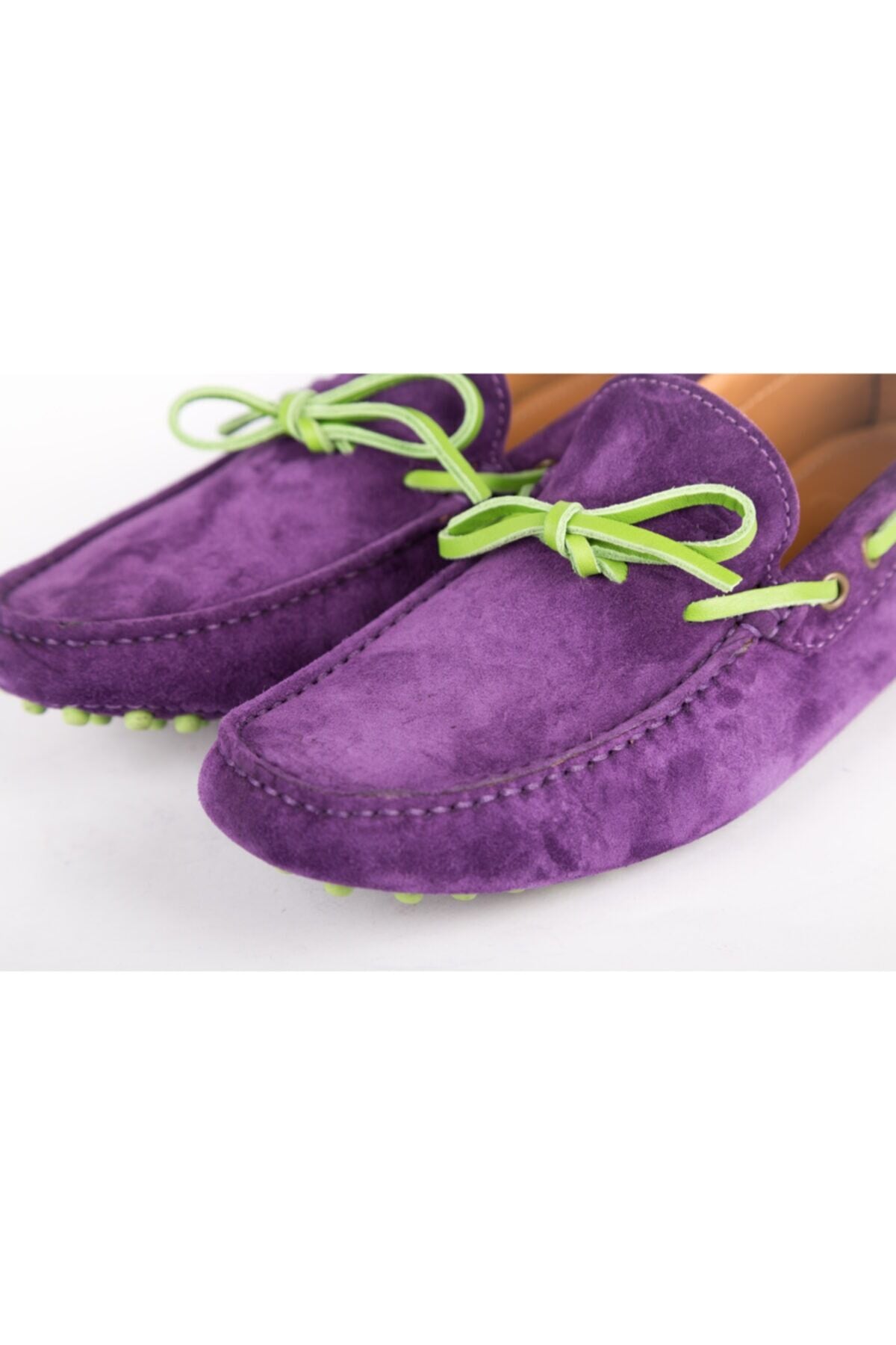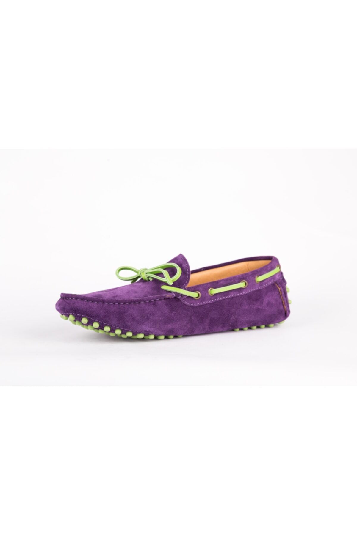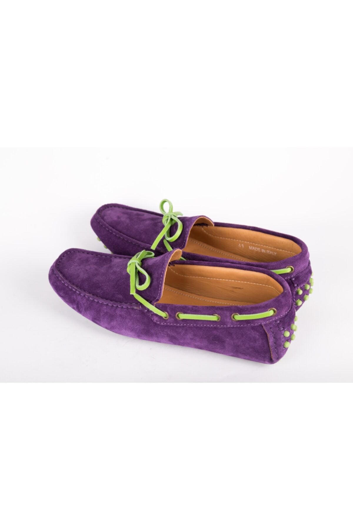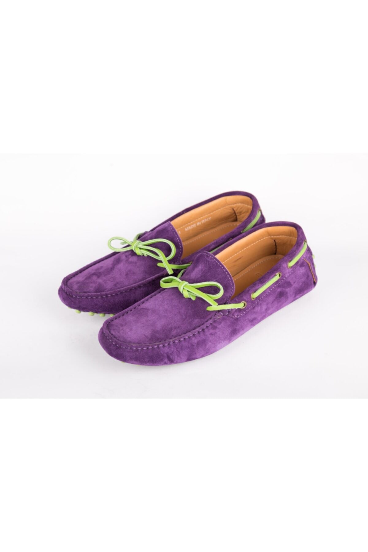 Mor süet deri, yeşil renk kontrastlı, bağcık detaylı loafer, made ın ıtaly