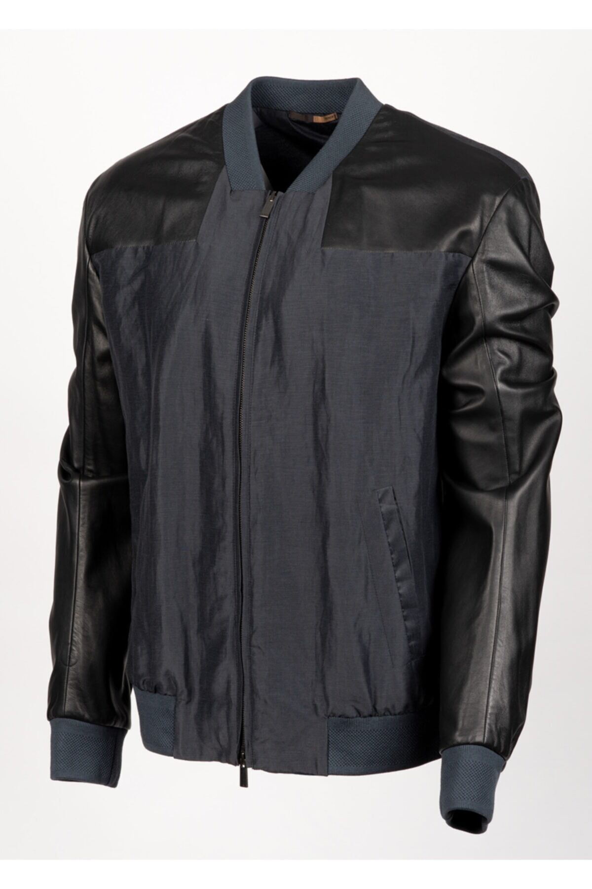 Siyah gri fermuar kapamalı % 85 linen %15 silk kollar ve göğüs %100 leather ana astar % 50 cotton % 50 polyamide diğer astar % 100 cotton mont , kolları ve etek uçları ribanalı , made in ıtaly