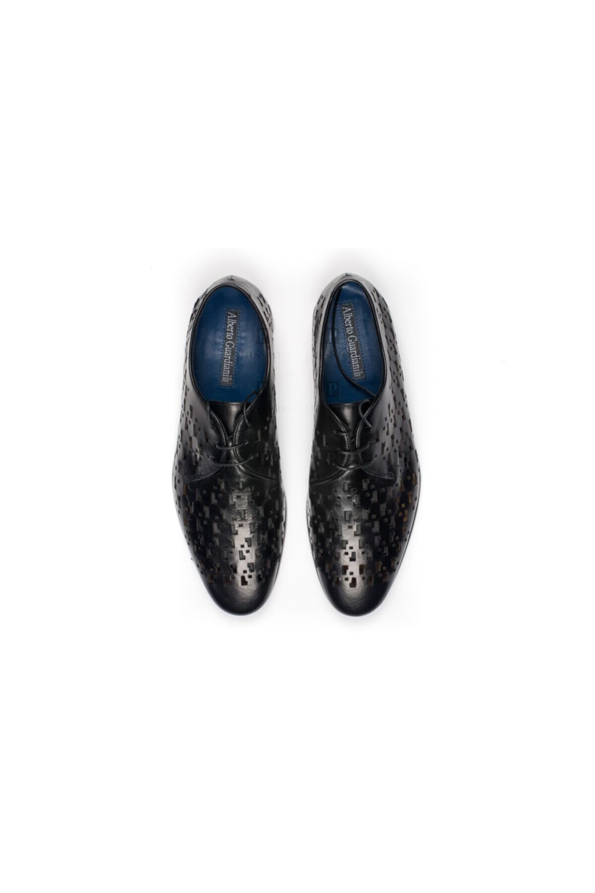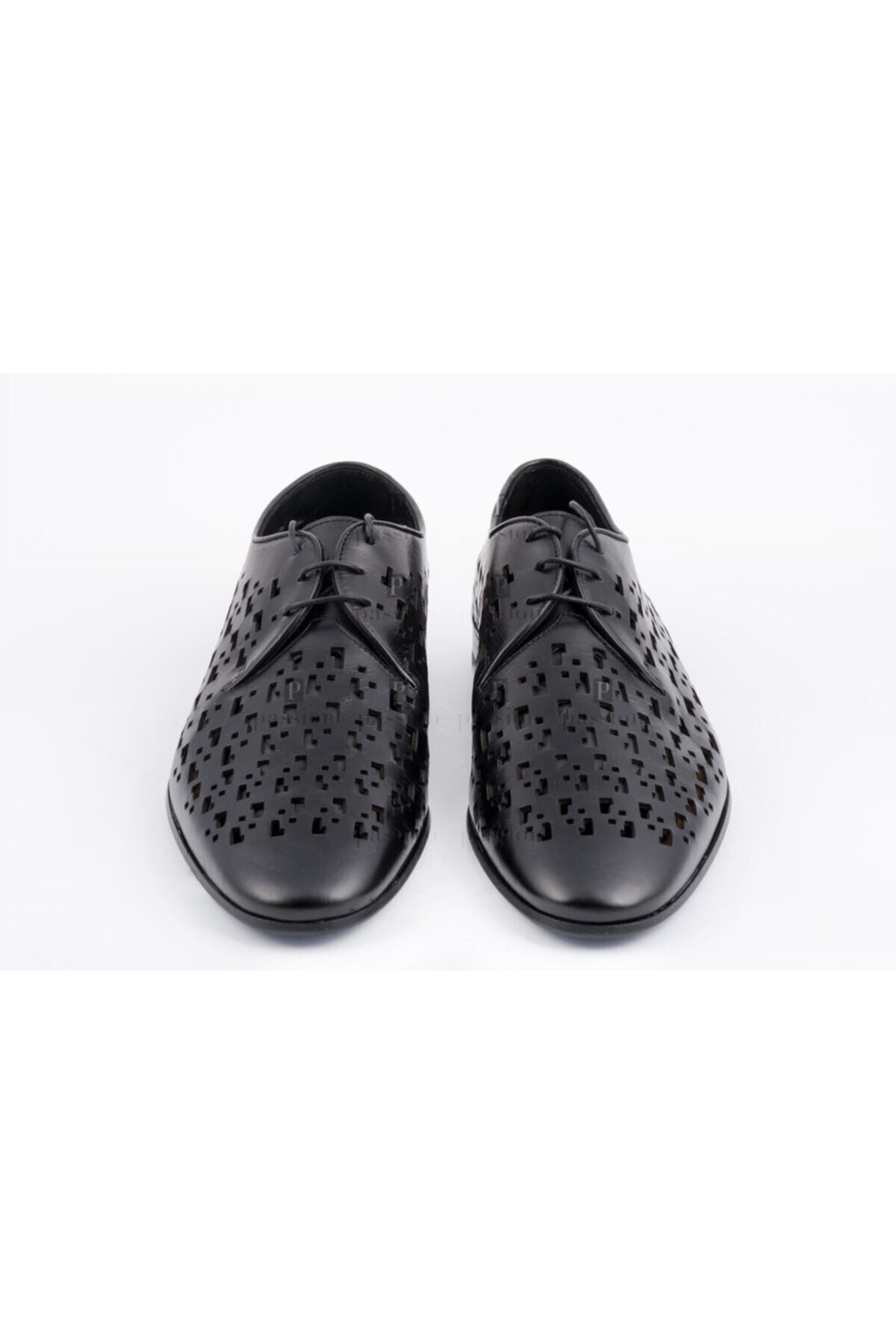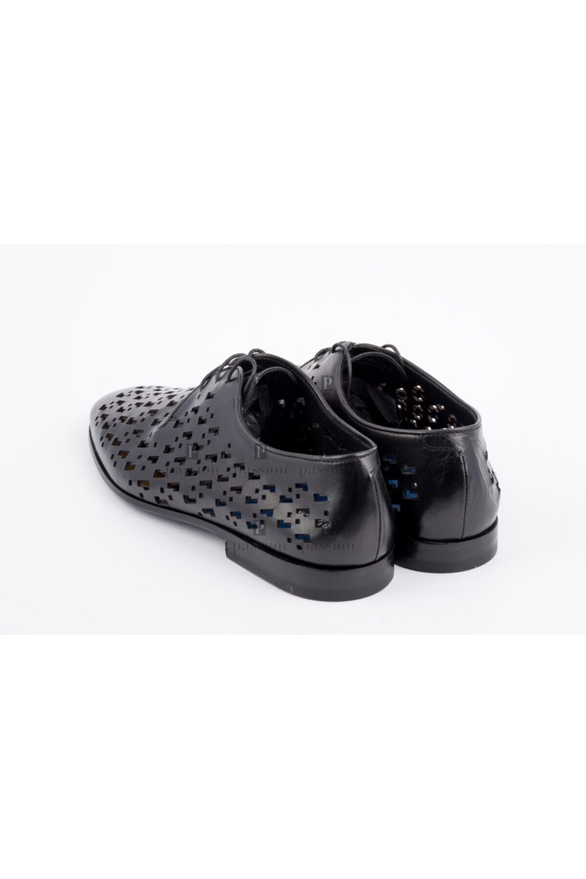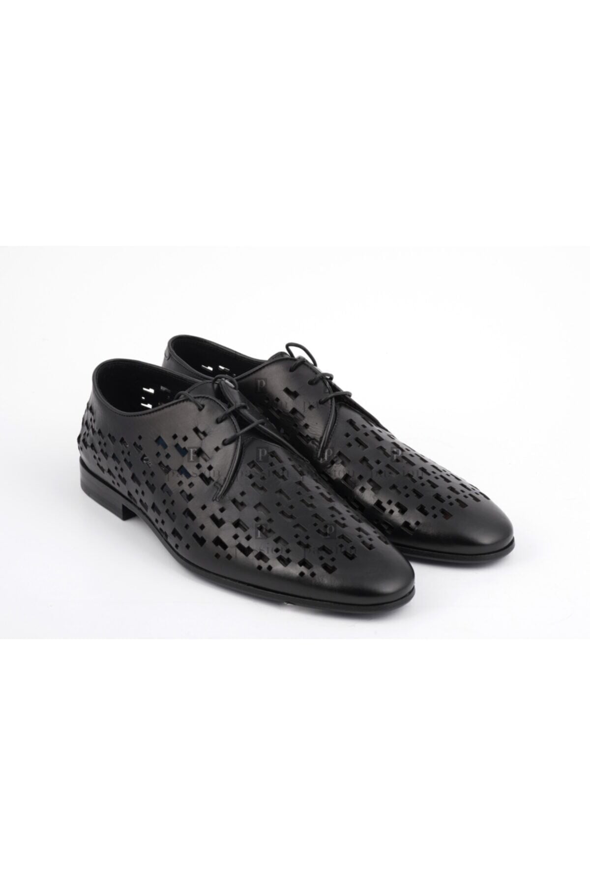 Siyah Deri Delik Detaylı Bağcıklı Ayakkabı