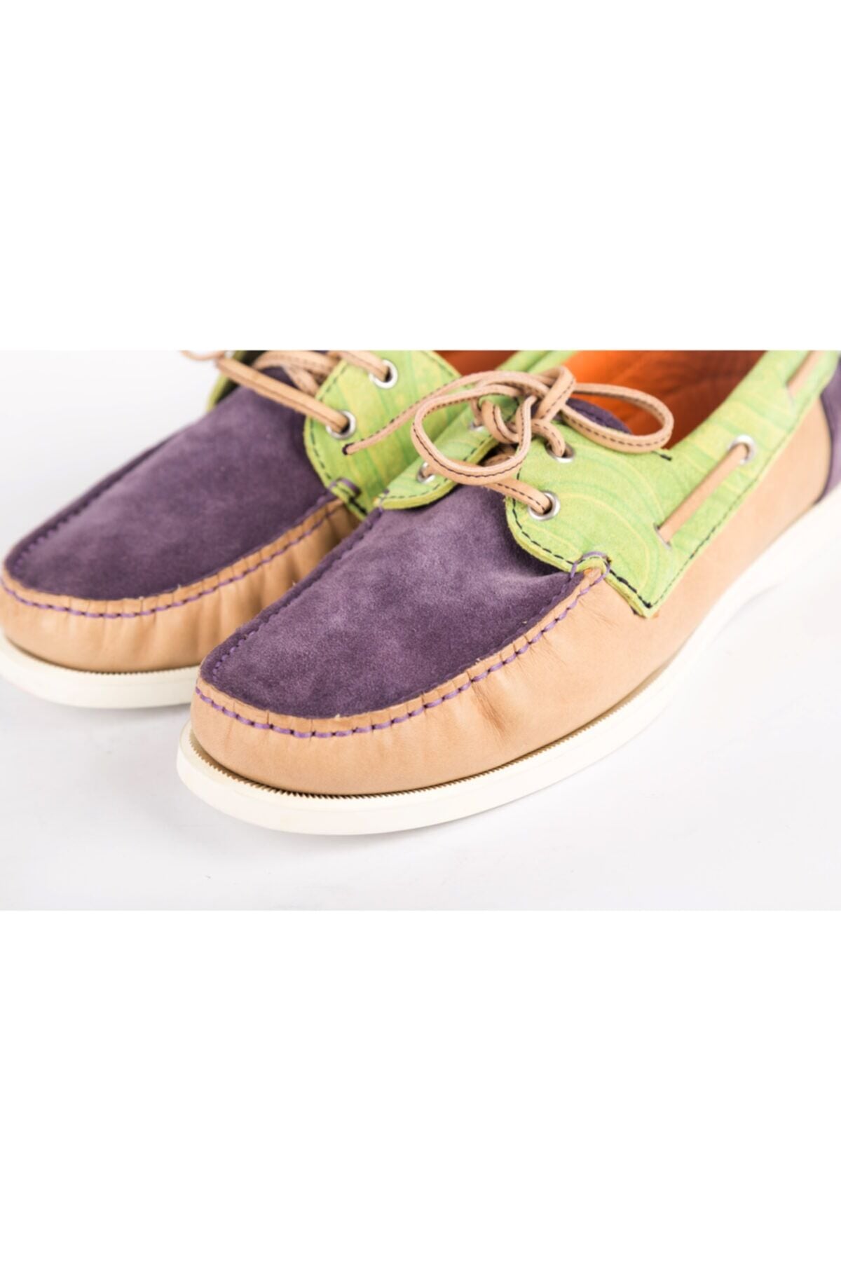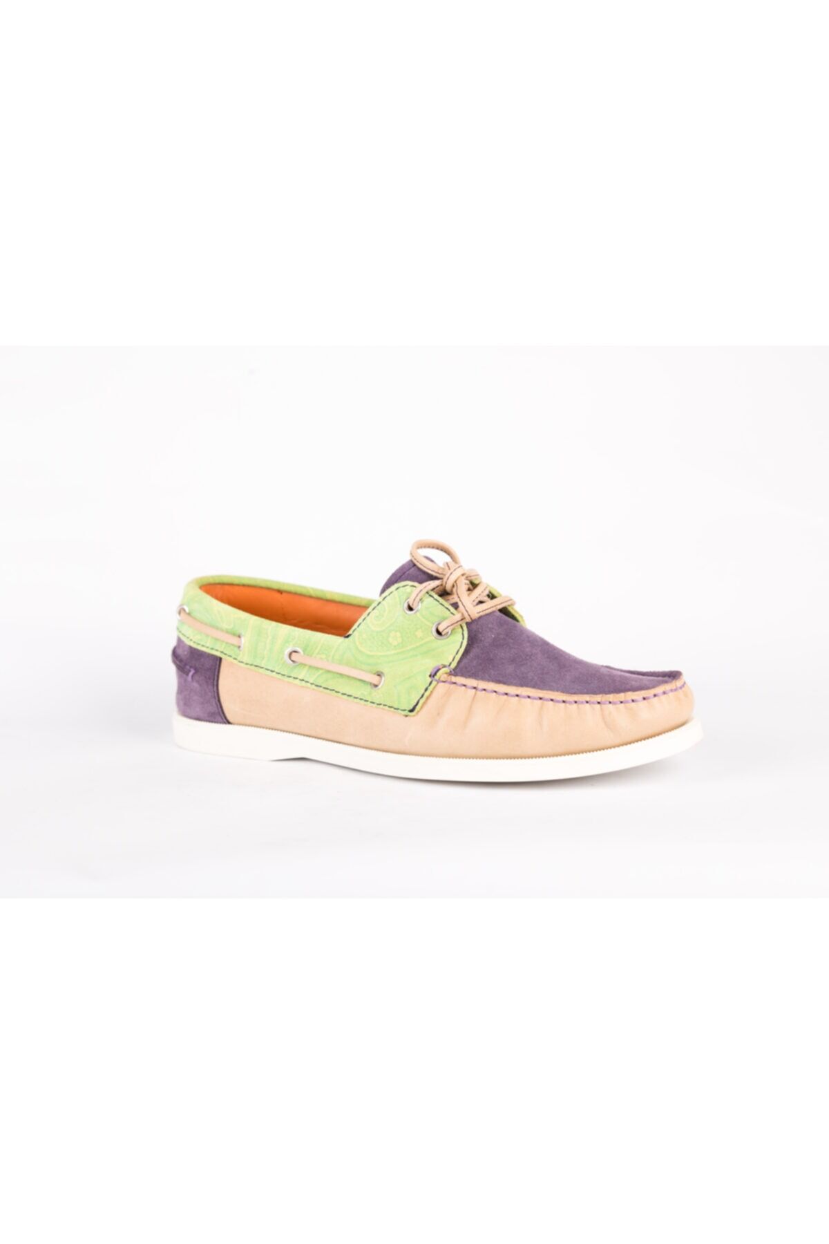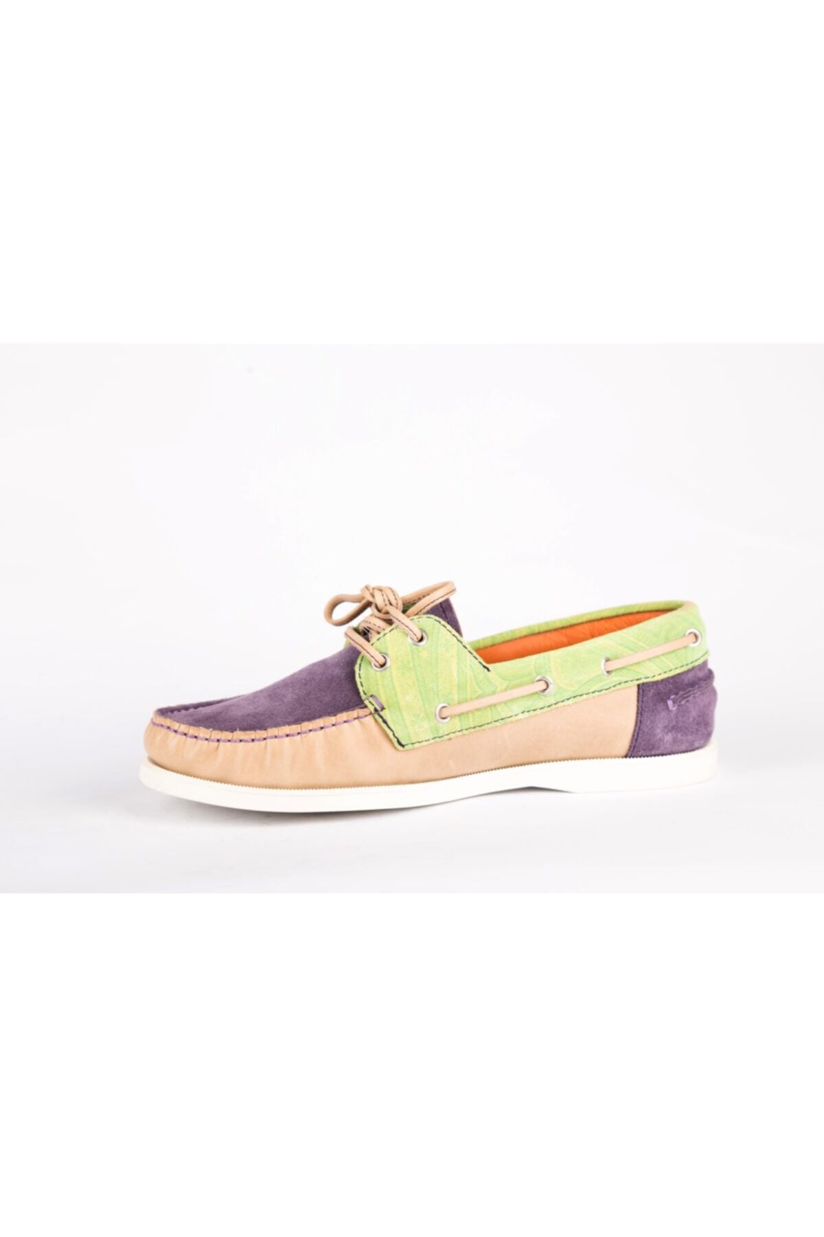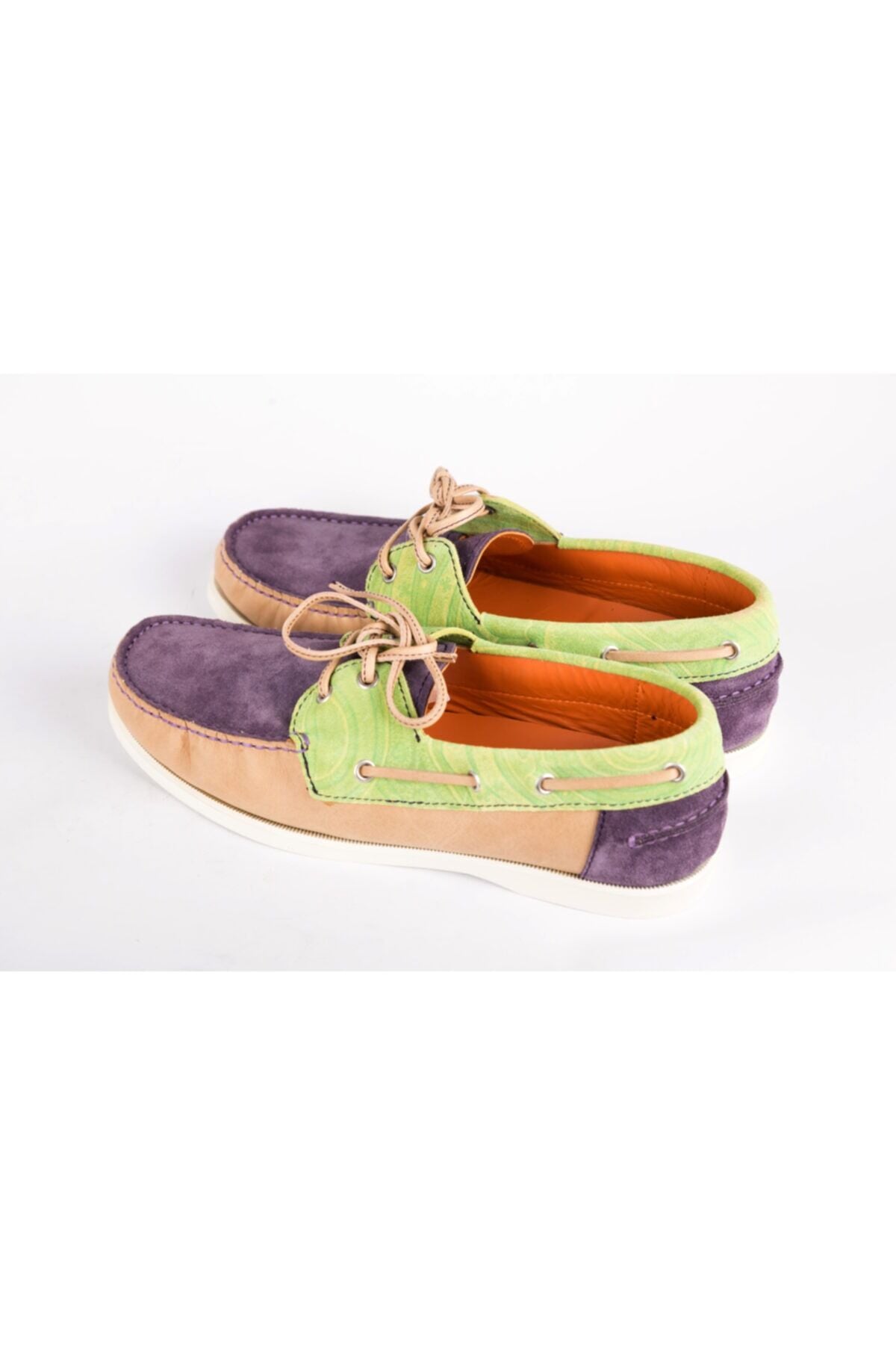 MOR YEŞİL SÜET, BEJ DERİ, BAĞCIKLI LOAFER, MADE IN HUNGARY