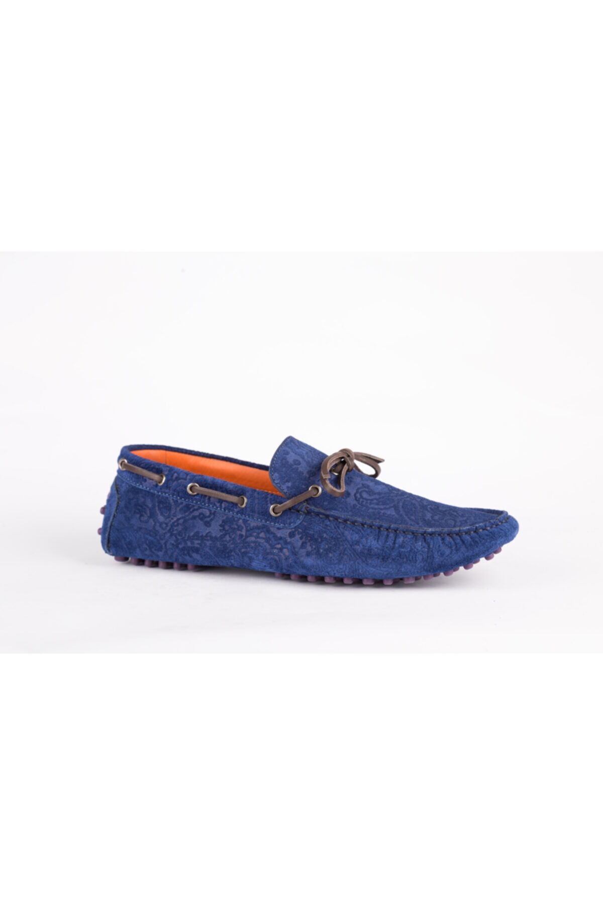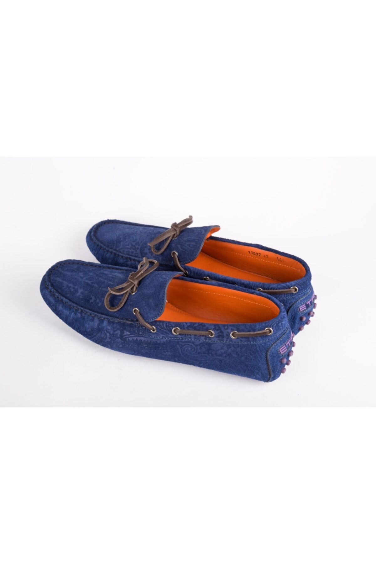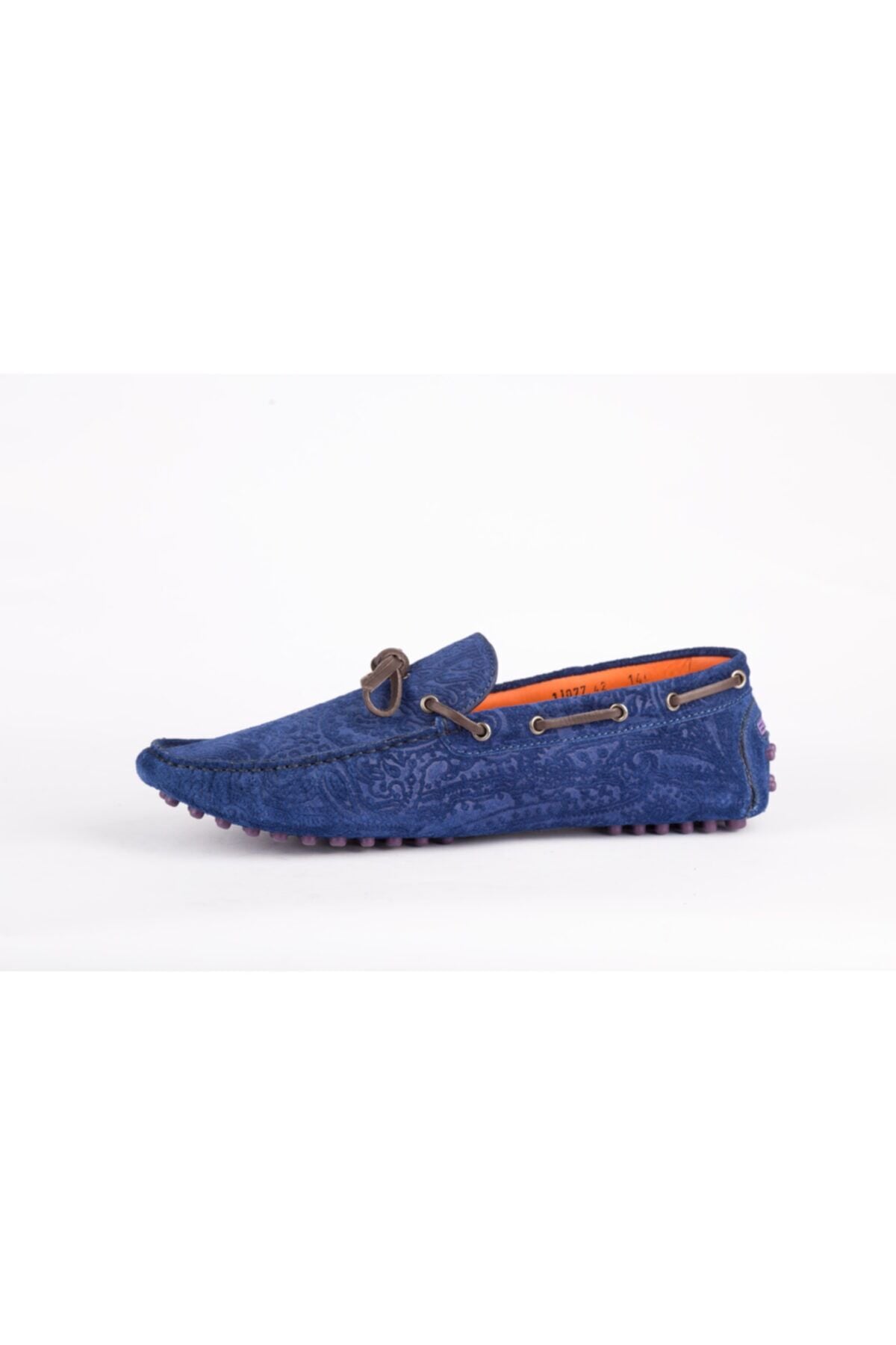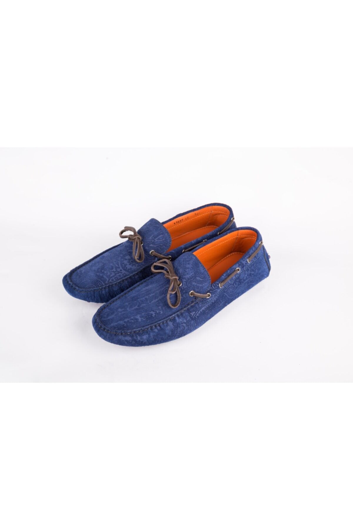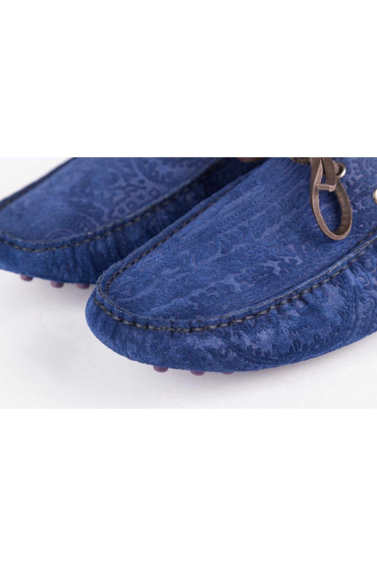 KOYU MAVİ SÜET DERİ, MOR VE KAHVERENGİ RENK KONTRASTLI, ŞAL DESENLİ, MADE IN ITALY