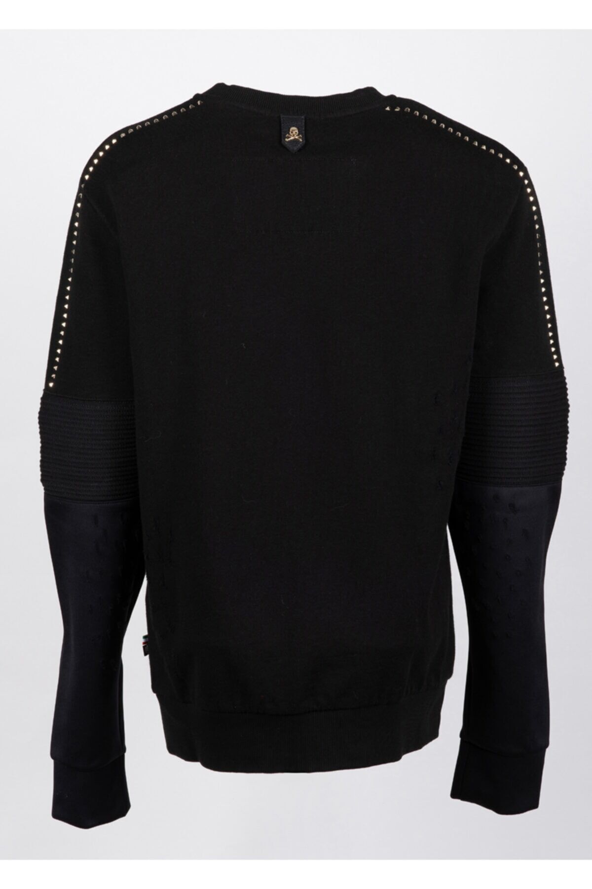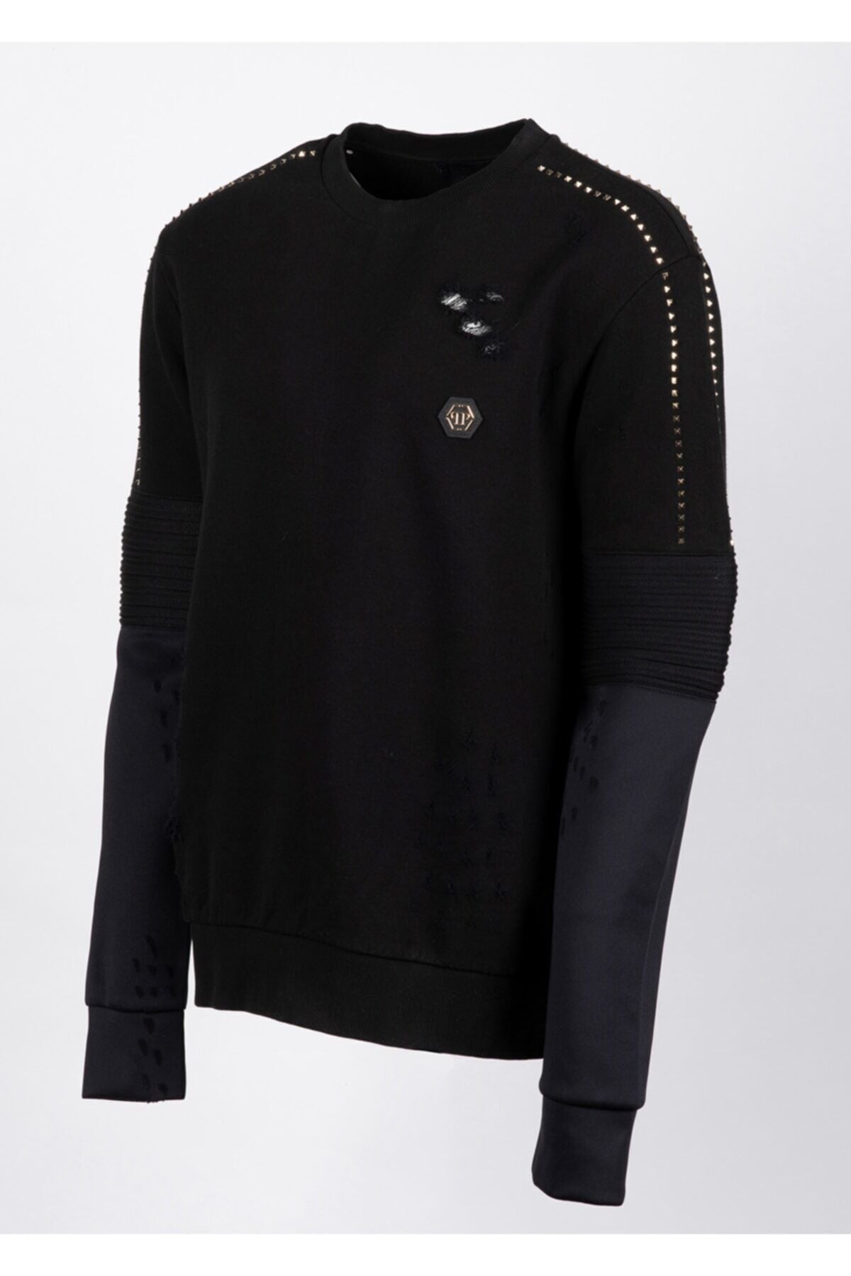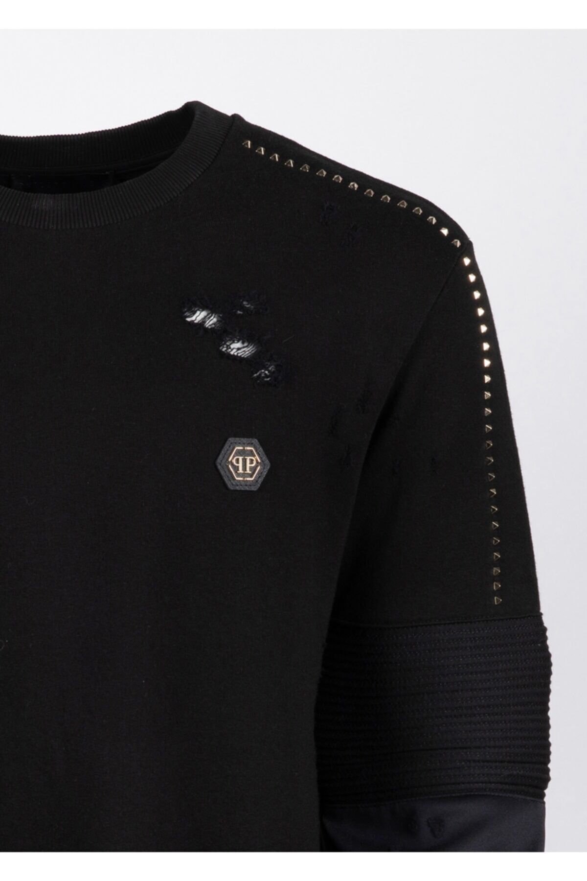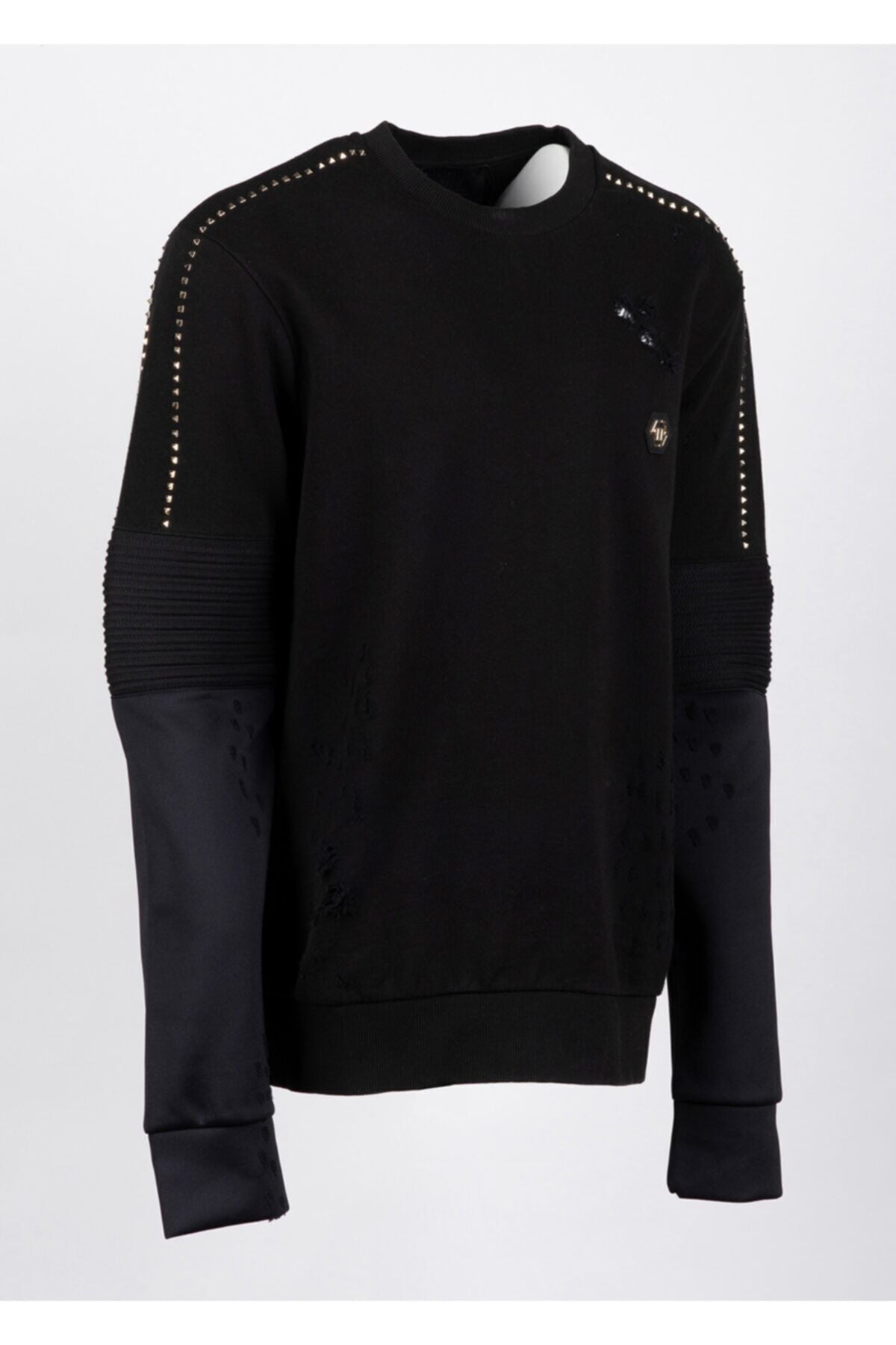 Siyah Trok, Yırtık, Kol ve Logo Detaylı %95 Pamuk %5 Elastan Sweatshirt Made in Italy